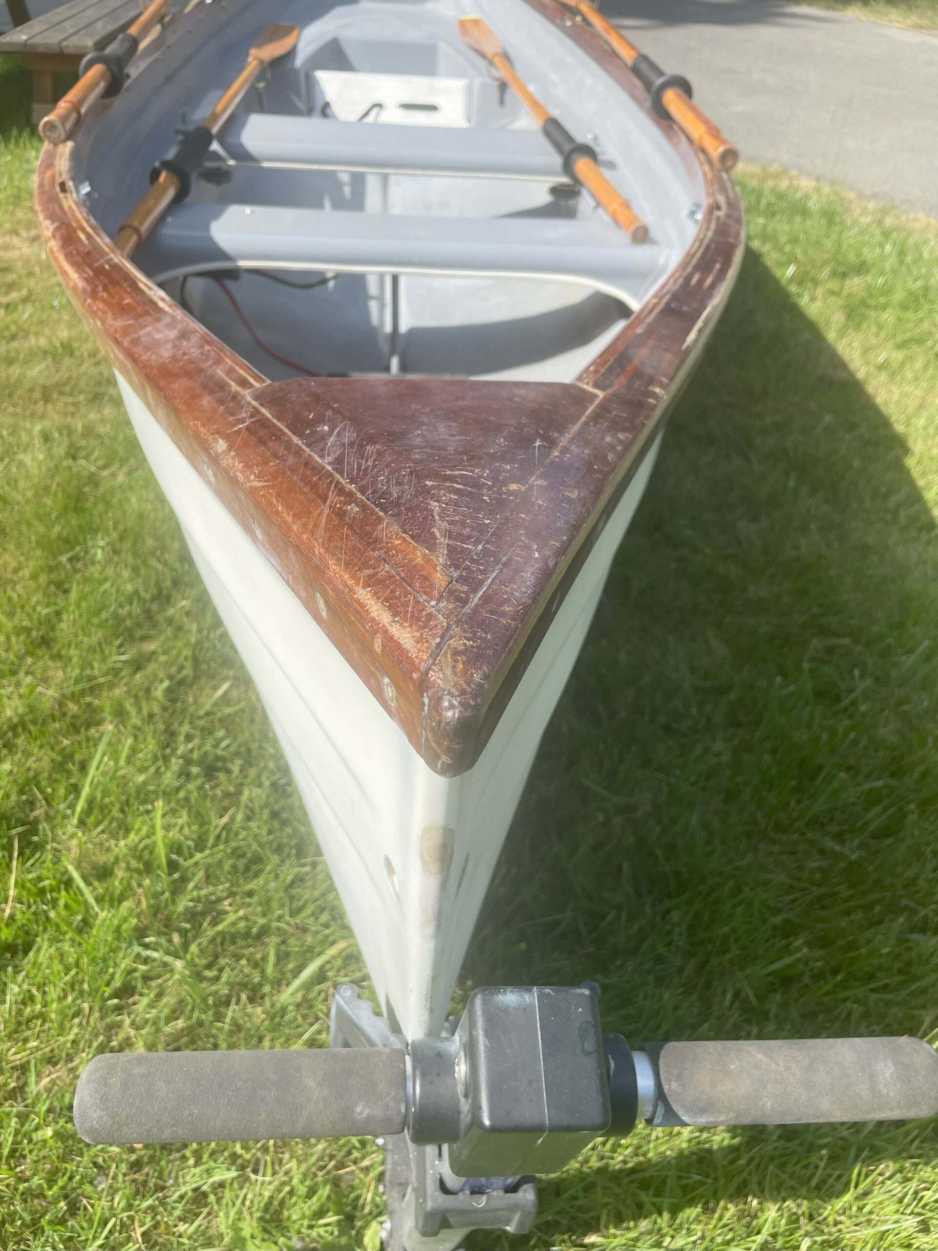 The wood trim has weathered with age, so that’s a cosmetic issue that the new owner could address if desired. Other than that, the boat is in great shape. We’ve done some reconditioning work on the fiberglass, so despite being 20 years old, this Whitehall should be an excellent rowing companion for at least another 20 years. She just needs a bit of TLC to make her sparkle again!