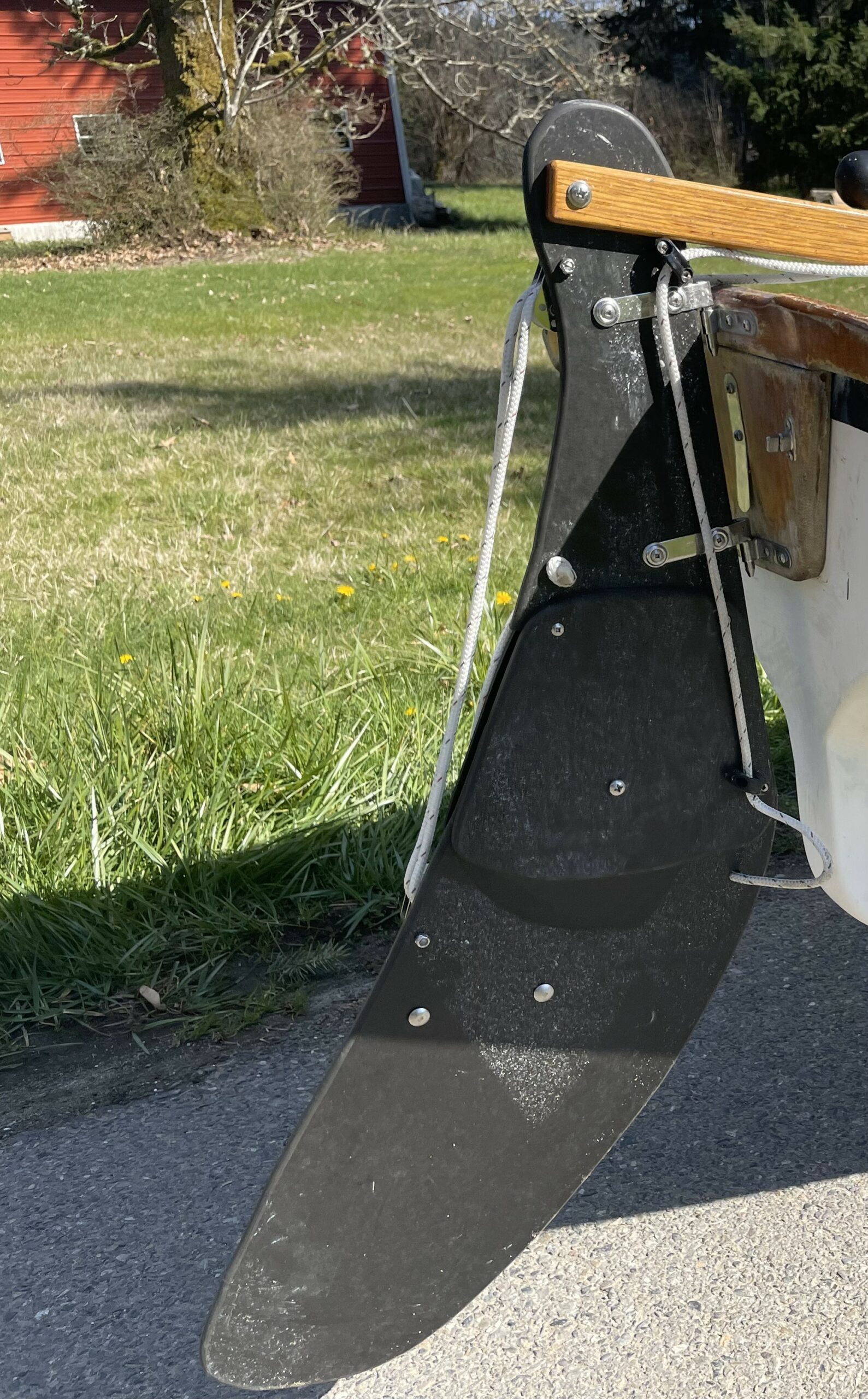 She also features a unique feature you wouldn’t find on a standard rowing Whitehall– a kick-up rudder with tiller extension. Occasionally we’ve had folks ask for us to put a rudder on a rowboat so that a passenger could help with steering from the stern seat position, while the rower pulls the oars without having to concern themselves with their bearing.
