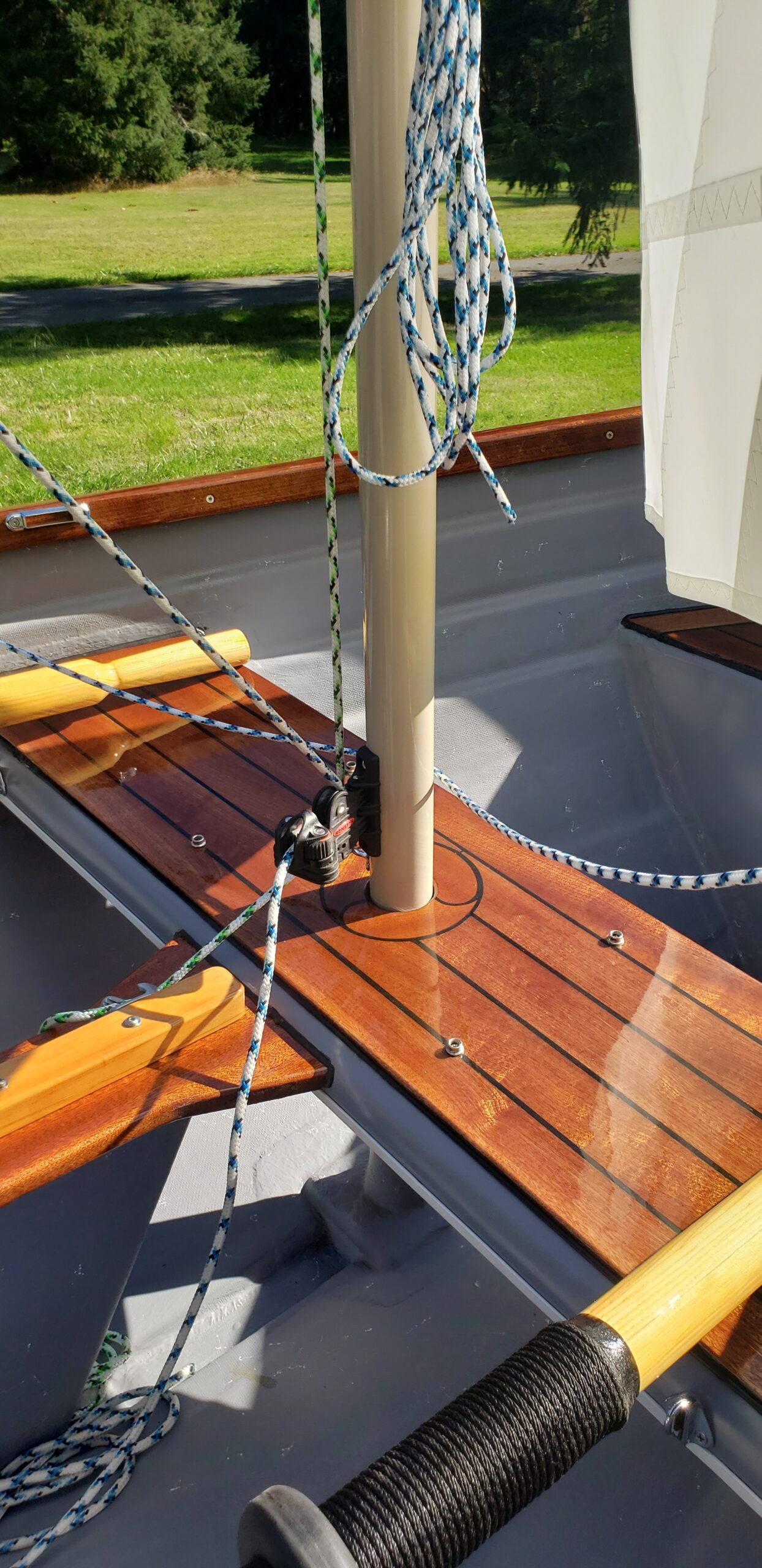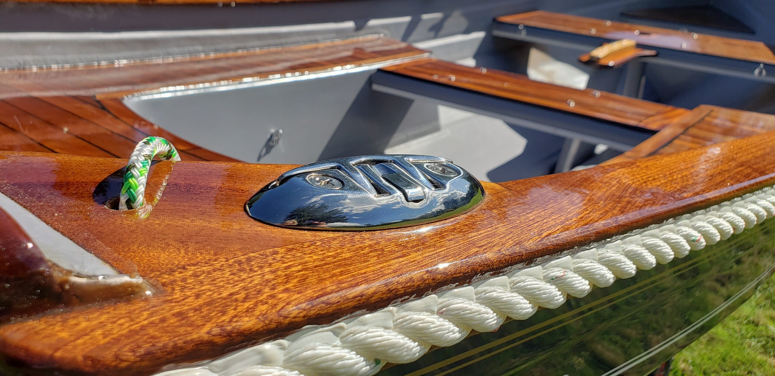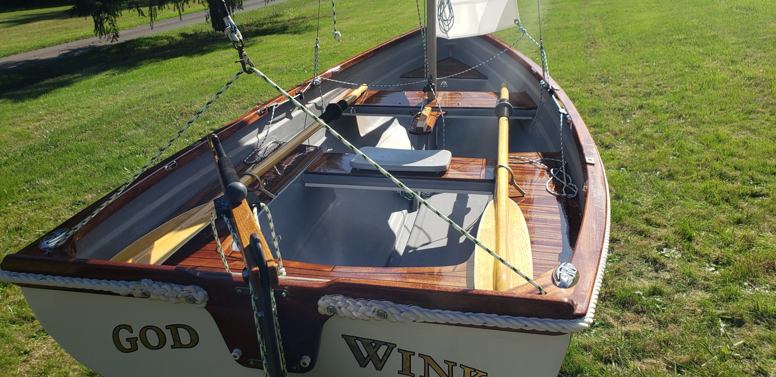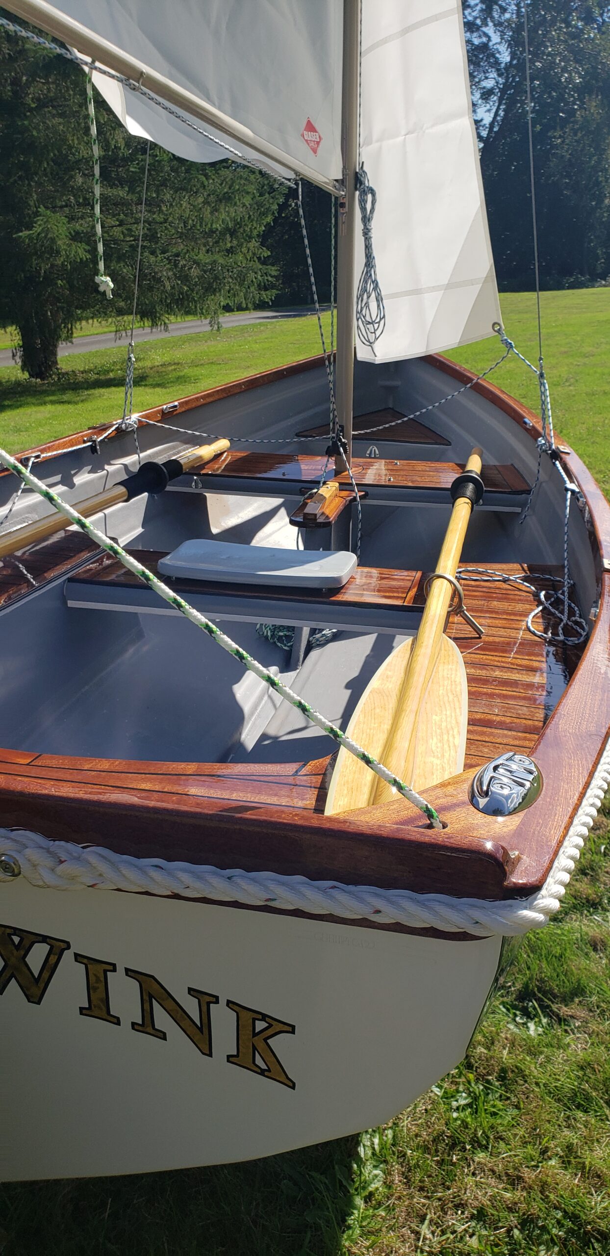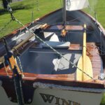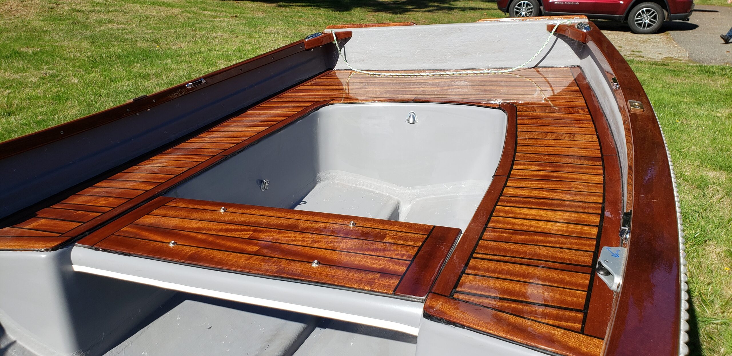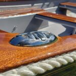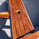 This brand new 12′ Point Defiance sailboat features jaw-dropping custom wood inlay seats. Built with extensive customizations, this sailboat features lightweight kevlar composite construction, wood trim with decorative rope bumper, deep “endeavor blue” gelcoat stripe with gold and white pinstriping, and incredible detailing on the custom wood seats. Just look at that custom “swirl” woodwork around the mast step!