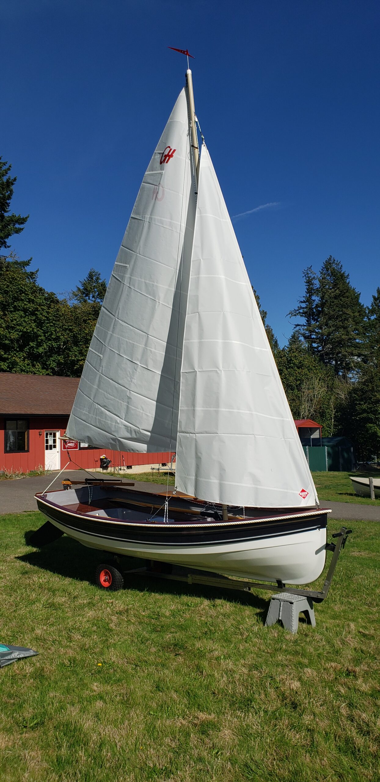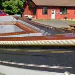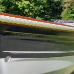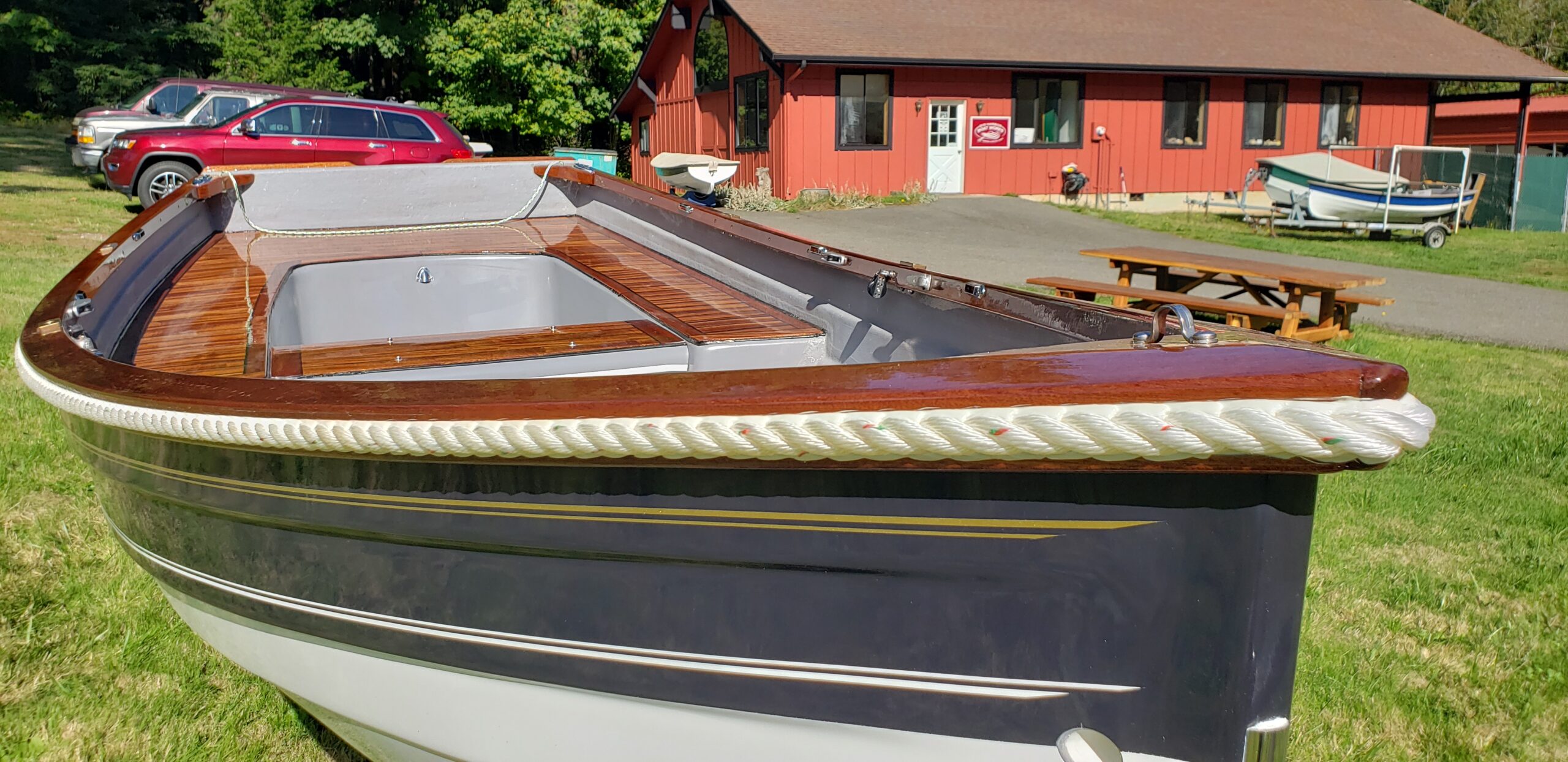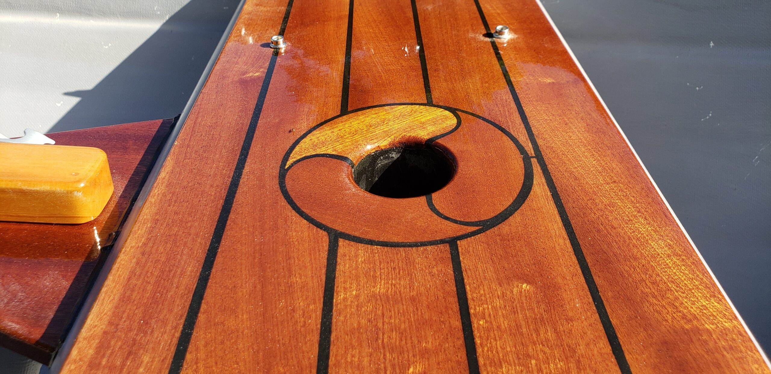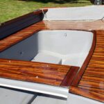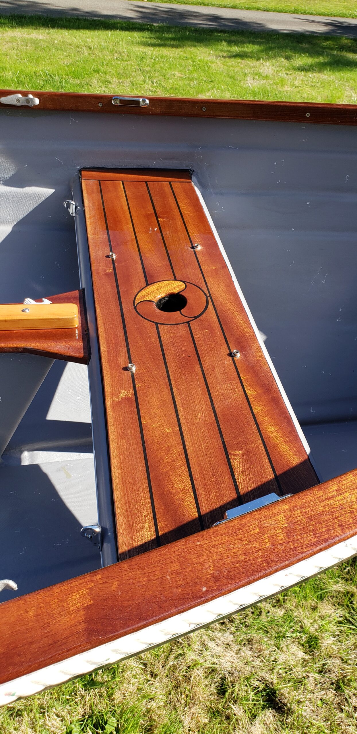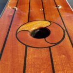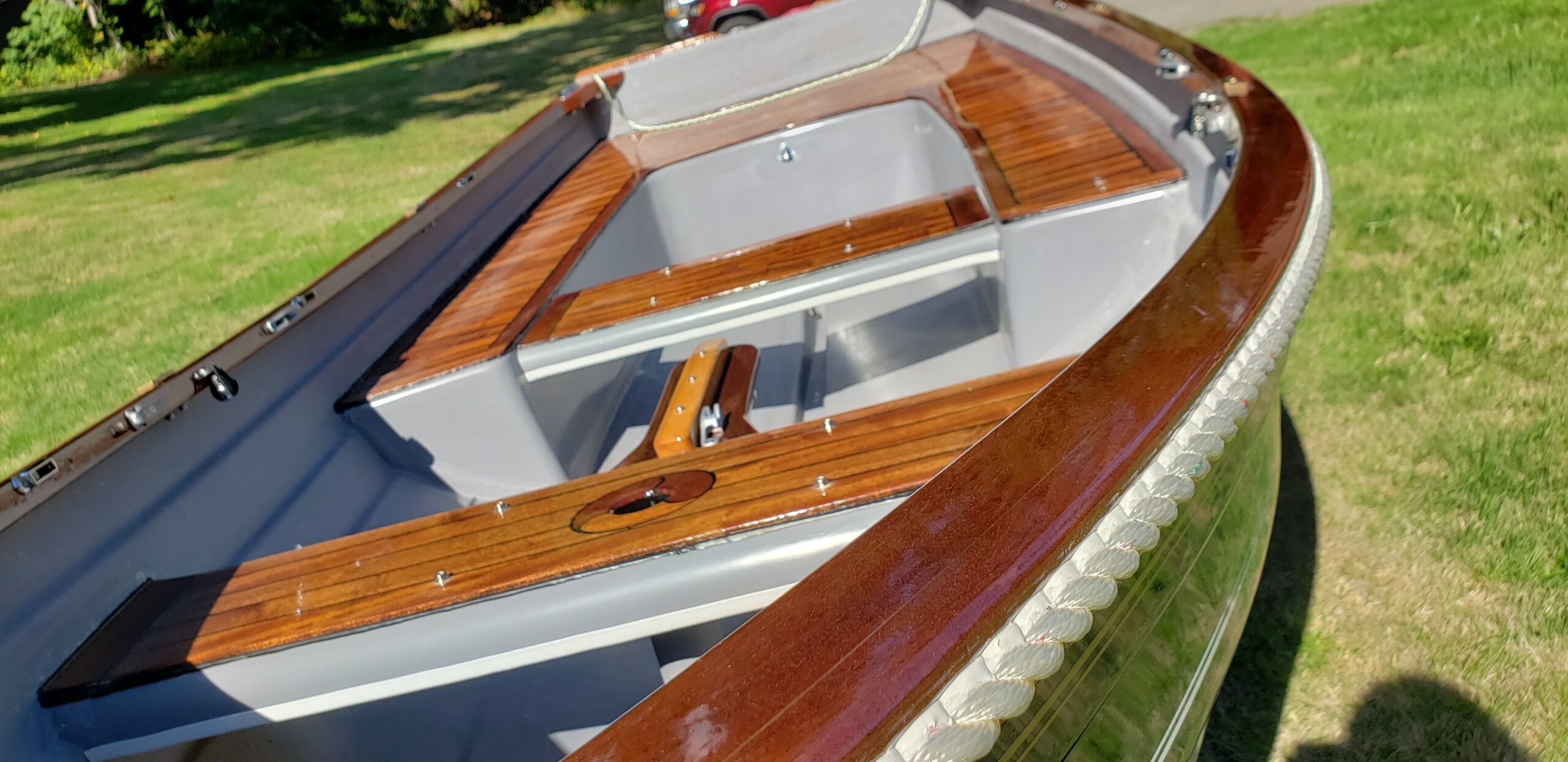 This brand new 12′ Point Defiance sailboat features jaw-dropping custom wood inlay seats. Built with extensive customizations, this sailboat features lightweight kevlar composite construction, wood trim with decorative rope bumper, deep “endeavor blue” gelcoat stripe with gold and white pinstriping, and incredible detailing on the custom wood seats. Just look at that custom “swirl” woodwork around the mast step!