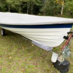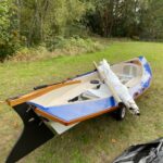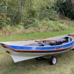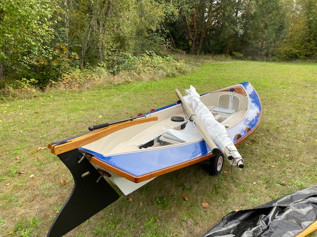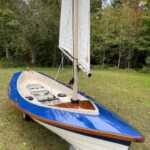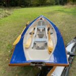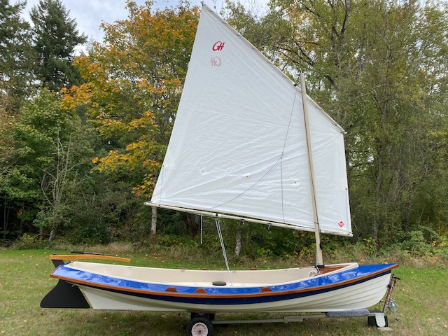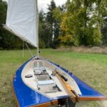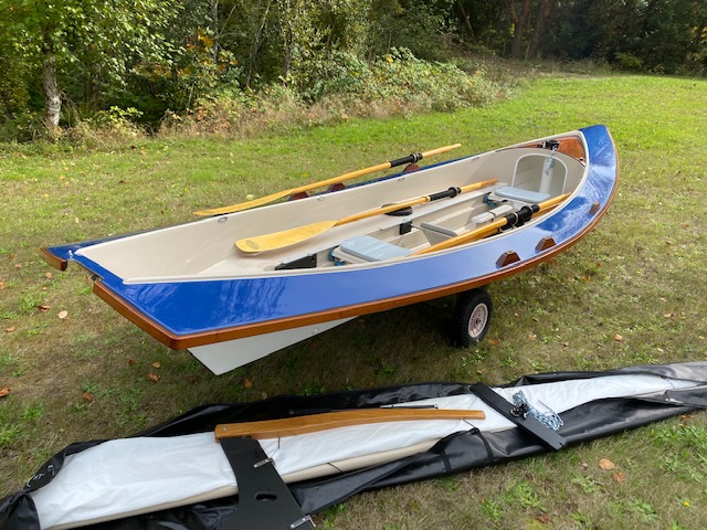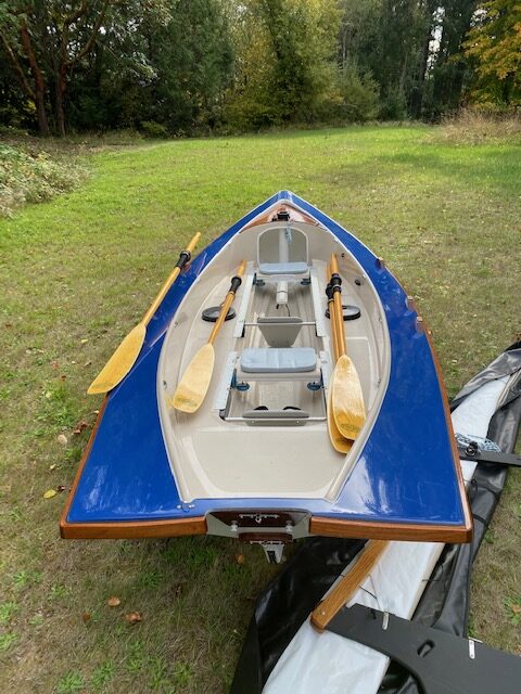 This boat comes with everything pictured including: Melonseed Sailboat with deck and tandem sliding seats, laminated wood sheer, dark blue deck and dark blue top strake on hull, custom wood inlay at mast base, stainless steel keel protection, 2 pairs of 9′ spoon oars, storage hatches, tiller extension, 2 seat cushions, jiffy reefing, gear bag, boat cover and beach dolly.