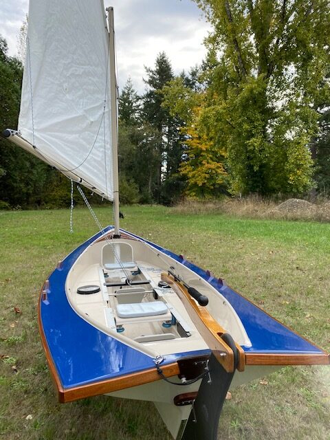 This is a boat you’ll be proud to own, and pass along to your progeny. It’s a 16.5′ Melonseed sailboat with a custom blue deck and varnished mast step which give it a handsome look. It was built 2 years ago and is in great shape. Its balanced lug rig sets up quick – after you drop in the mast, attach the halyard and the lazyjacks to get the sail bundle in the air, ready for anything. Tandem rowing is always possible and when the wind comes up, just pull the rope.