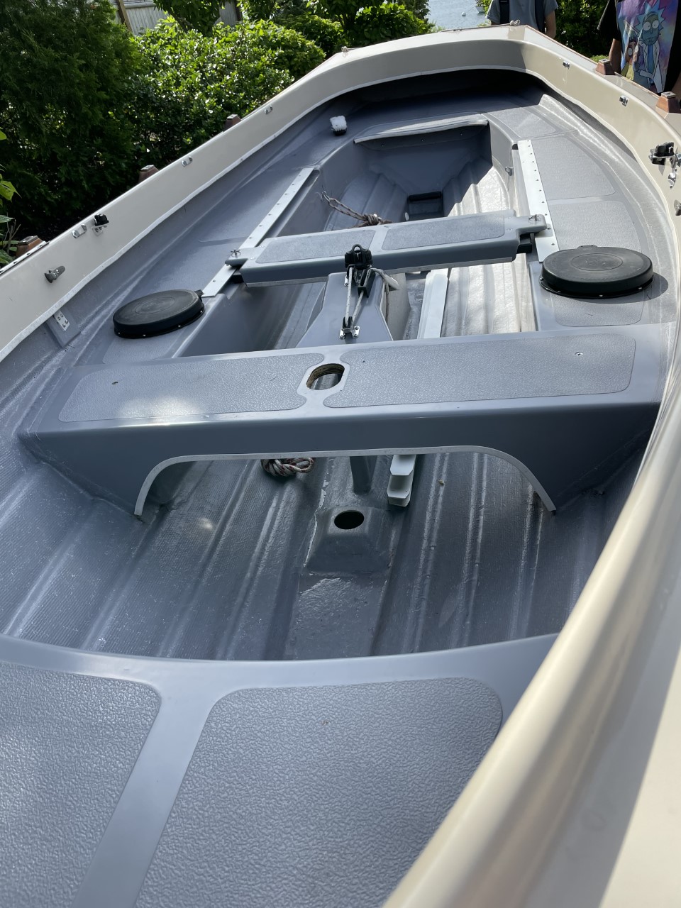 This 2015 Jersey Skiff Sailboat is in great condition and is well-equipped for performance sailing. The owners have absolutely loved her but now need to part with the boat as it no longer fits their lifestyle. This boat sports the classic white exterior/gray interior color scheme and the standard adjustable (non-sliding) seat, with the added touch of wood trim with rope to give it the ultimate traditional look.