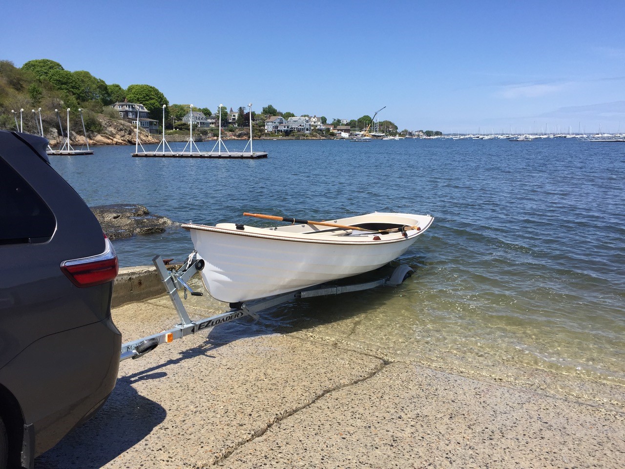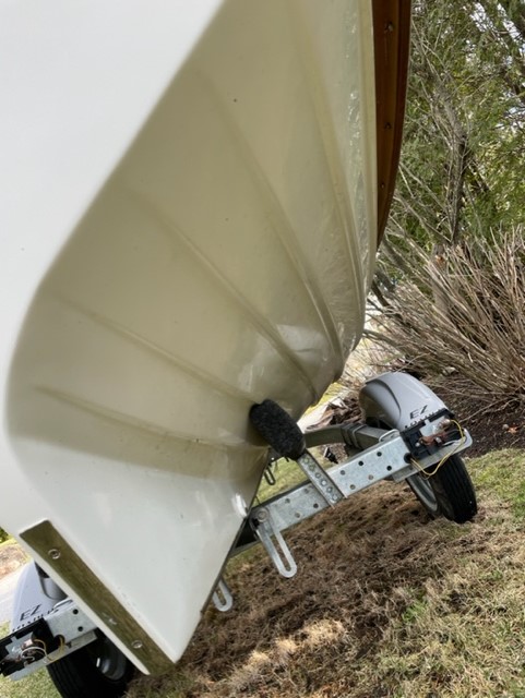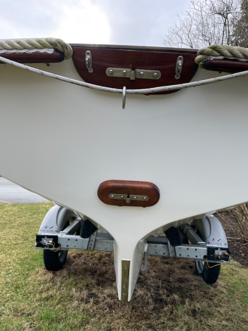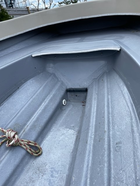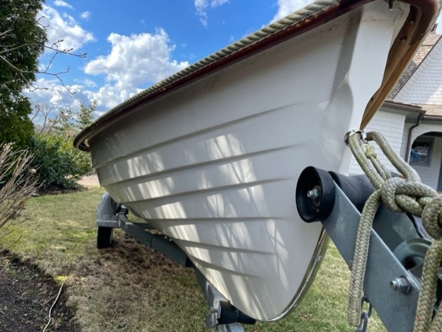 This Jersey Skiff has been gently used in Marblehead Harbor, both under sail and as a rowboat. The hull exterior and interior are in excellent shape. The wood trim has the weathered patina that comes from prolonged exposure to New England weather, but it could be refinished by someone handy who wants to put some sweat equity in to restore it to its former glory! (And the boat does come with a cover to keep it protected.)