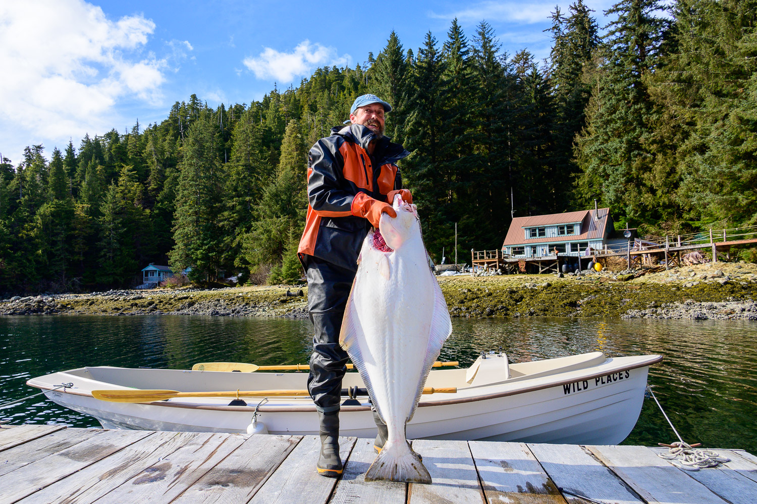 Catching a 70 pound halibut from the Salish Voyager is less intimidating than hooking into a giant halibut from a kayak, but it was still plenty exciting. This one was caught on a hand line. We decided to row it to shore to land it, as having a live halibut this size aboard could seriously injure us.