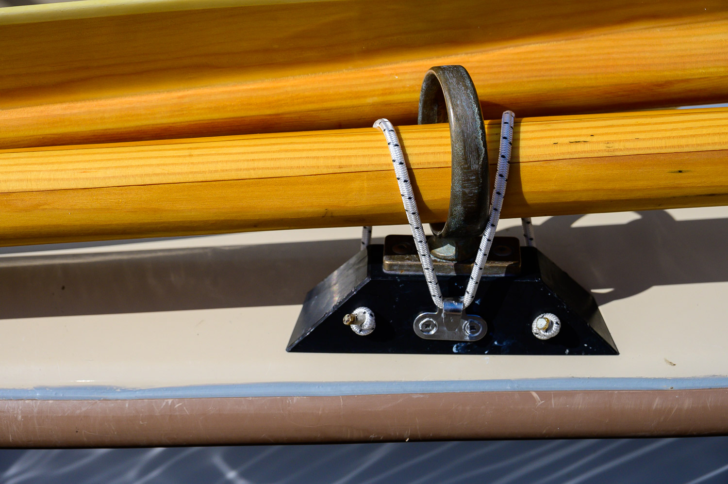 We have gotten questions about what to do with the oars while sailing. We keep them in the oarlocks. This spring, we added some simple bungie cords to secure the oars while sailing and when leaving her at anchor.