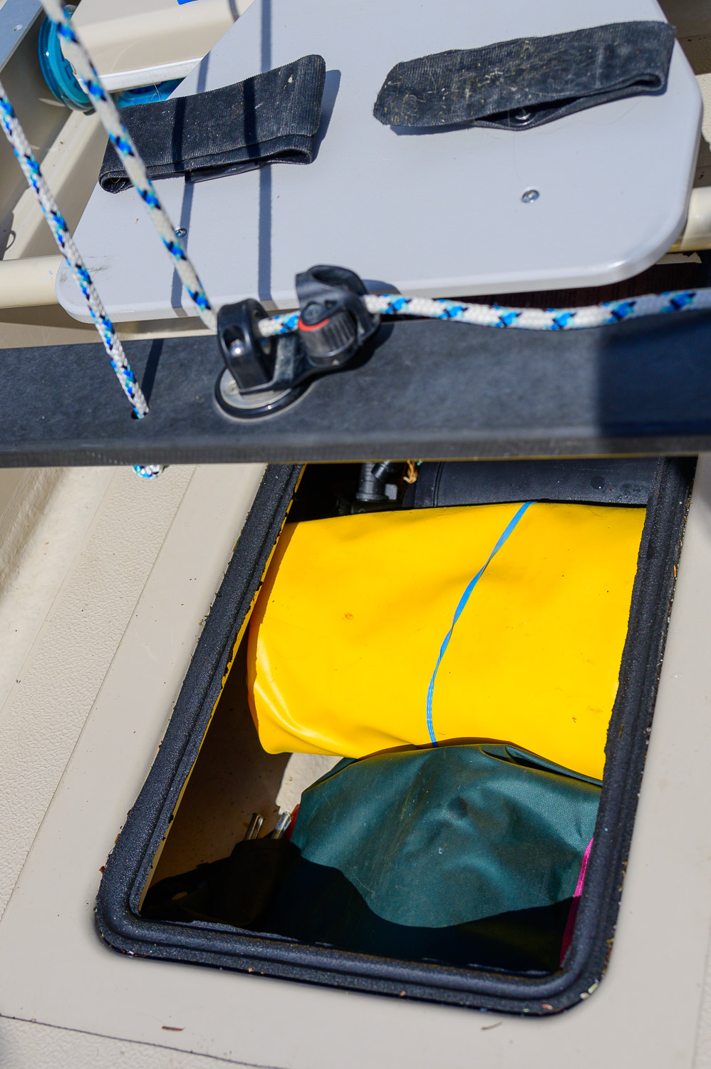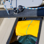 Last summer our lower hatch leaked quite a bit–not a surprise for a large floor hatch in a place where it can rain four inches a day. This year we added a self adhering gasket from a marine supply store. We also lubricated the small rubber gasket on the tighteners and used dry suit zipper wax on the threads. The result is a nearly dry hatch!