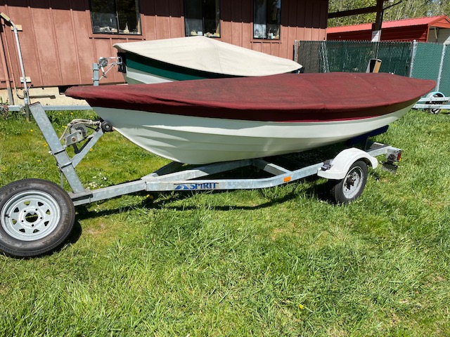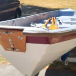 This 16′ Swampscott Dory was built in 2001, it’s in great shape and comes with a sliding rowing seat, kevlar composite construction, stainless steel keel strip, a matching burgundy boat cover to match the burgundy gel coat stripe, storage hatches forward and aft. It also comes equipped with two sets of 9′ spoon oars and a trailer with spare tire.