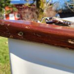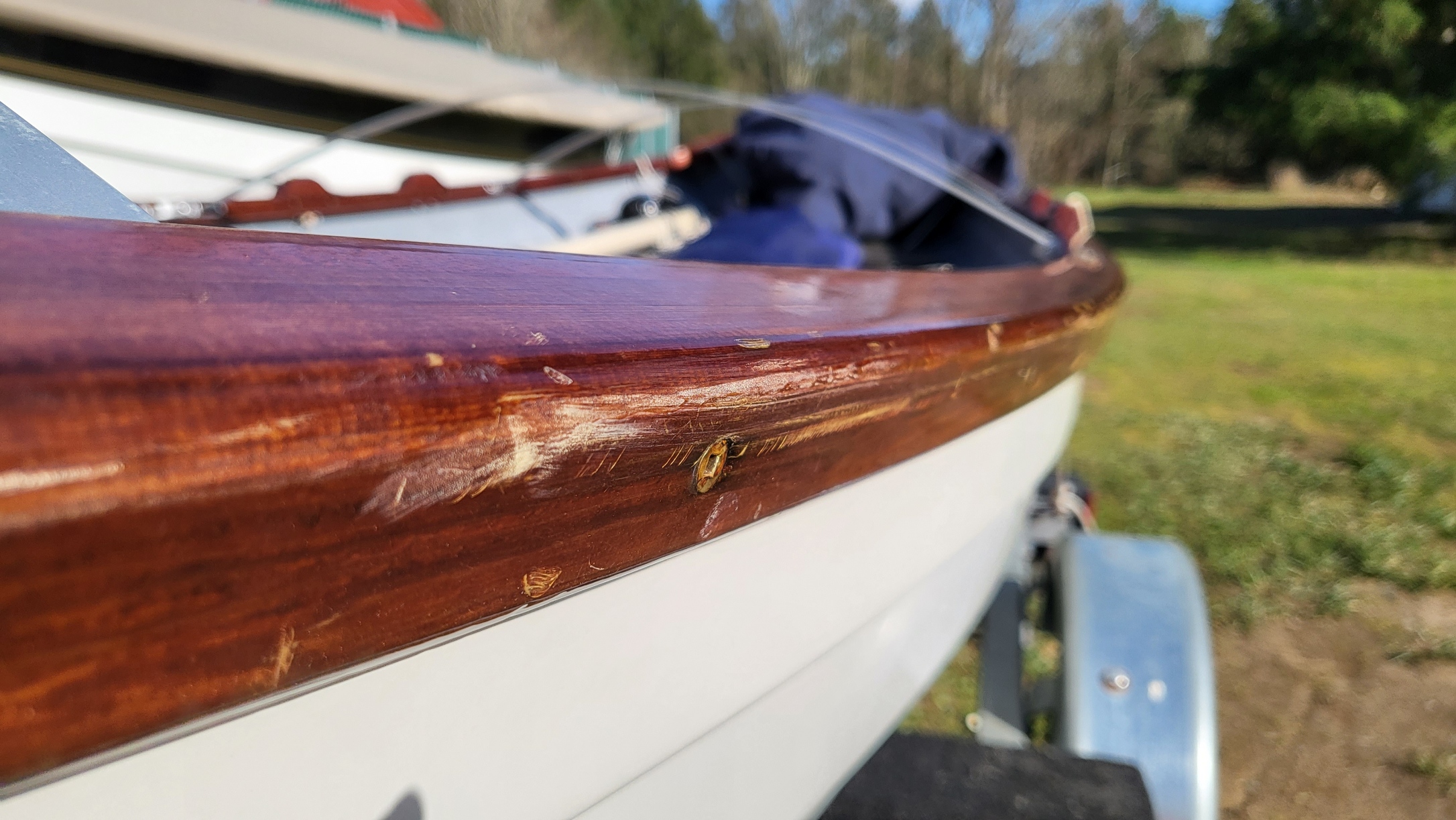 Pre-owned condition notes: This single-owner sailboat has been well-loved, but it has been stored indoors for most of its life and is still in great condition, overall! We are currently making a structural repair to the mast step, but that will be good-as-new when the new owner takes this beauty home so that doesn’t impact the asking price. The asking price does reflect some wear-and-tear damage to the wood trim, which you’d expect in a boat of this age, however the finish on the wood trim is in excellent shape so the new owner will have some time before a refinish is needed. The close-up photos below show the worst of the wood dings to give you an idea of what to expect.