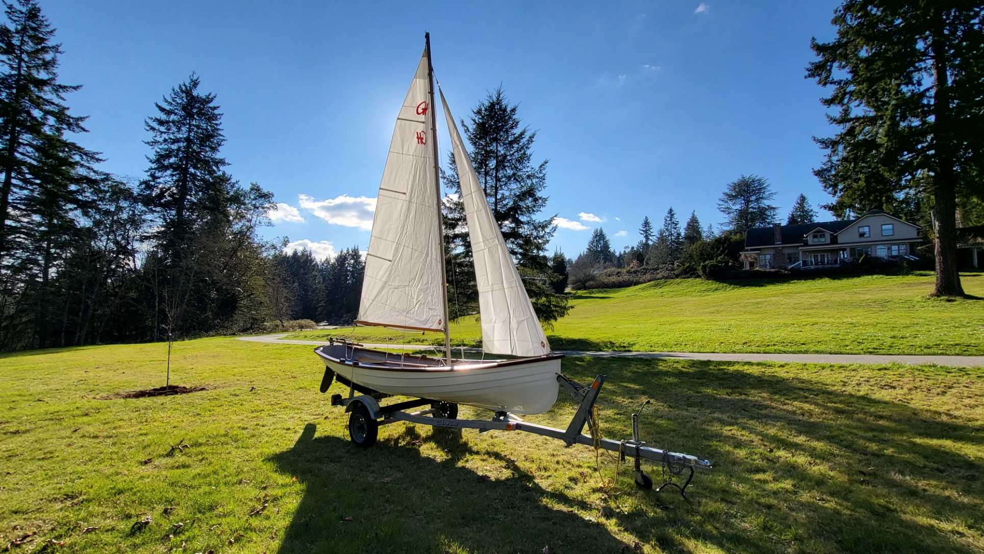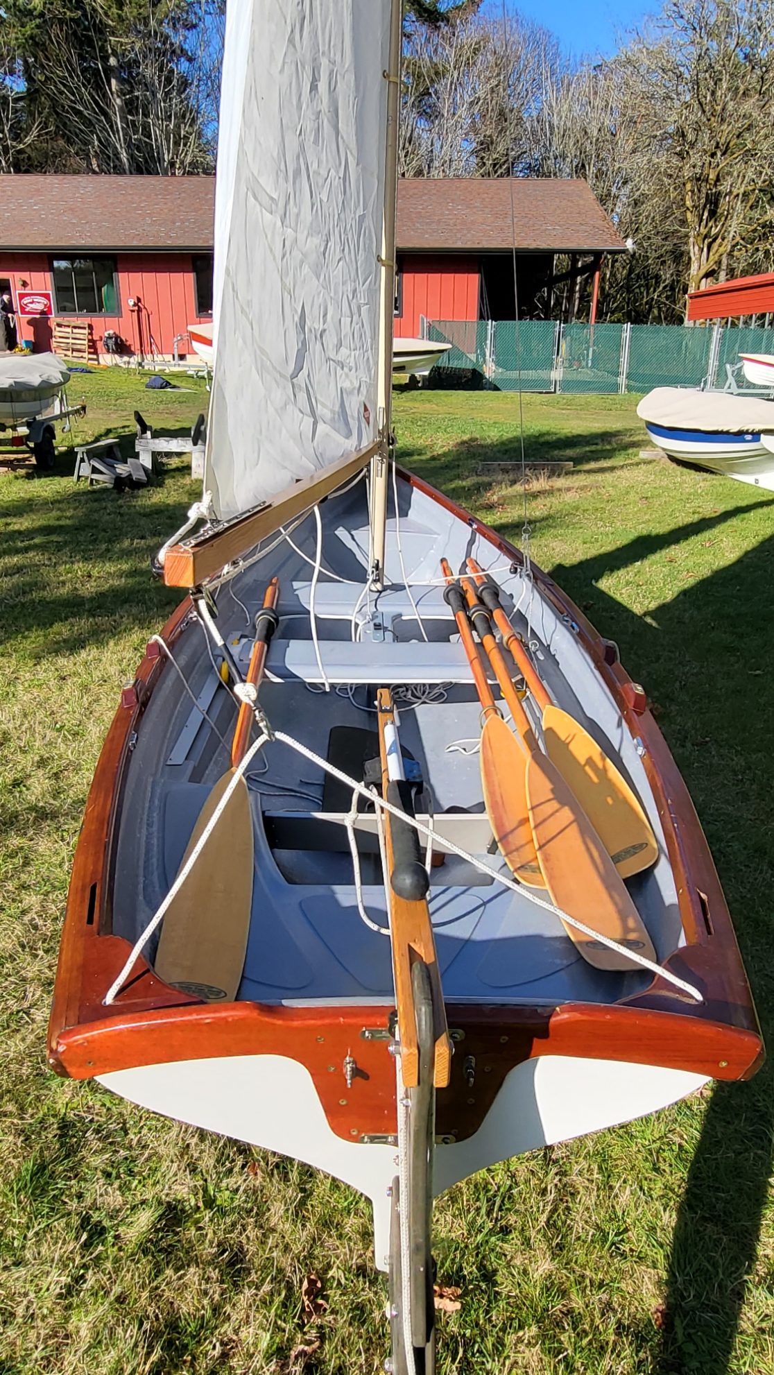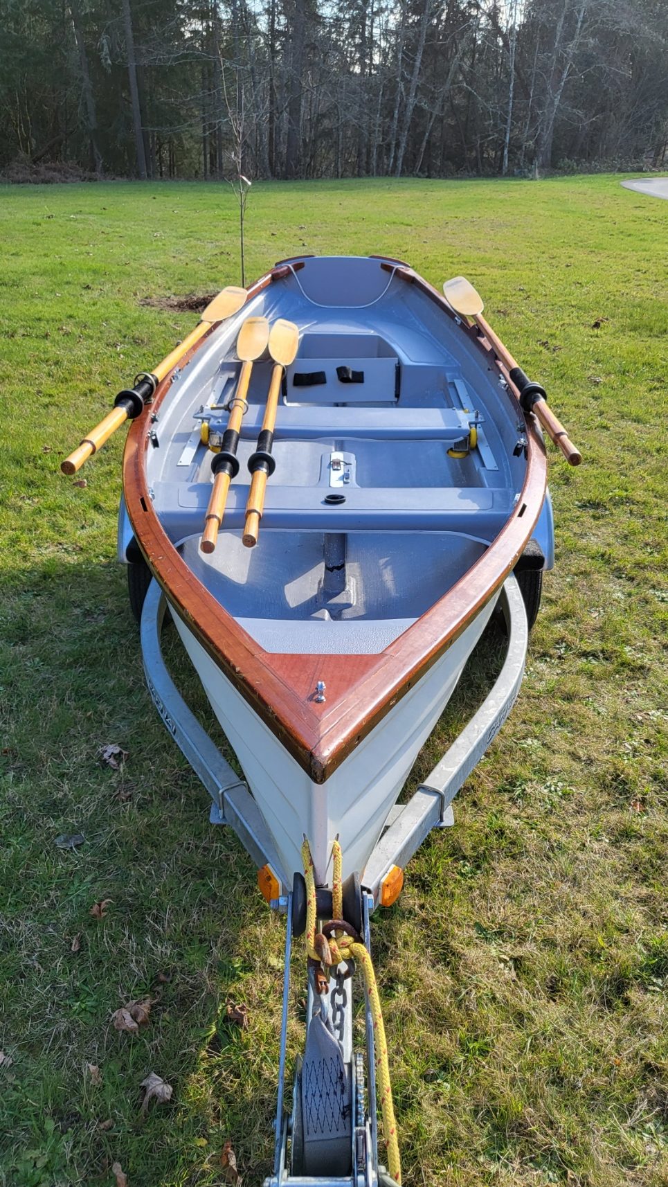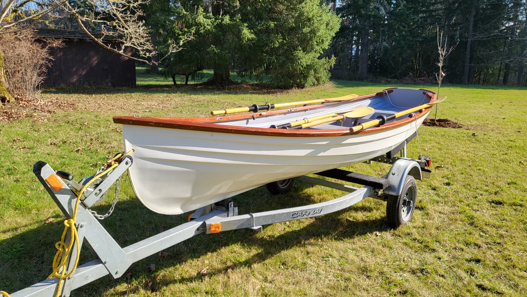 We are thrilled to have a lovely Whitehall Sailboat for sale that just arrived on consignment at our shop in Gig Harbor! Originally built in 2008, this sailboat in classic white is a beauty with wood trim, sliding rowing seat, stainless steel keel, kick-up rudder, tiller extension, and 2 pairs of 8′ wood spoon oars. A custom navy blue canvas cover and trailer are also included!
