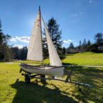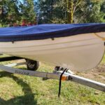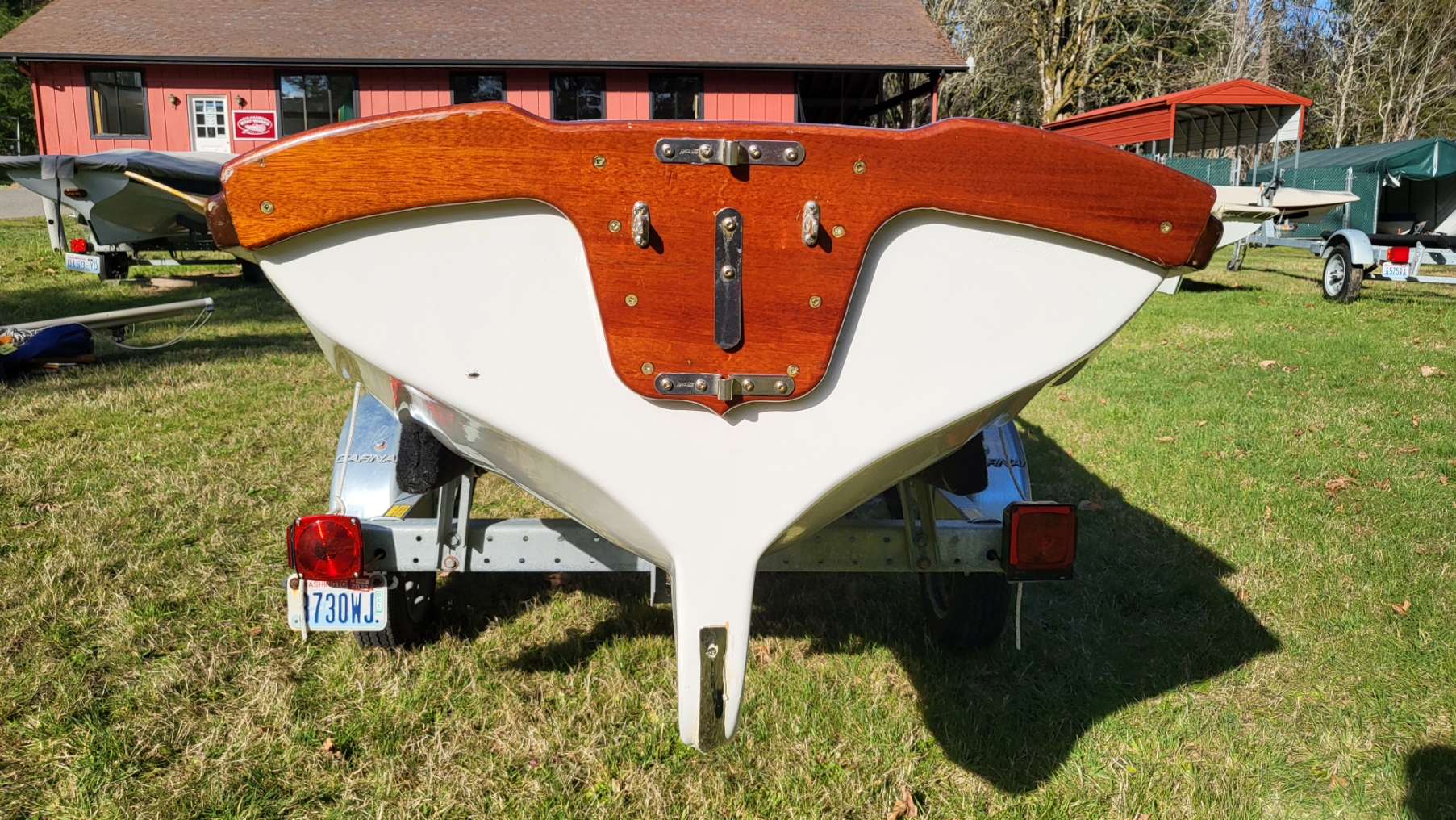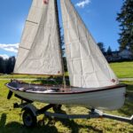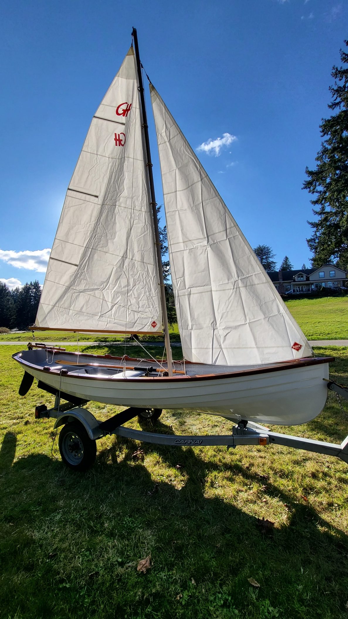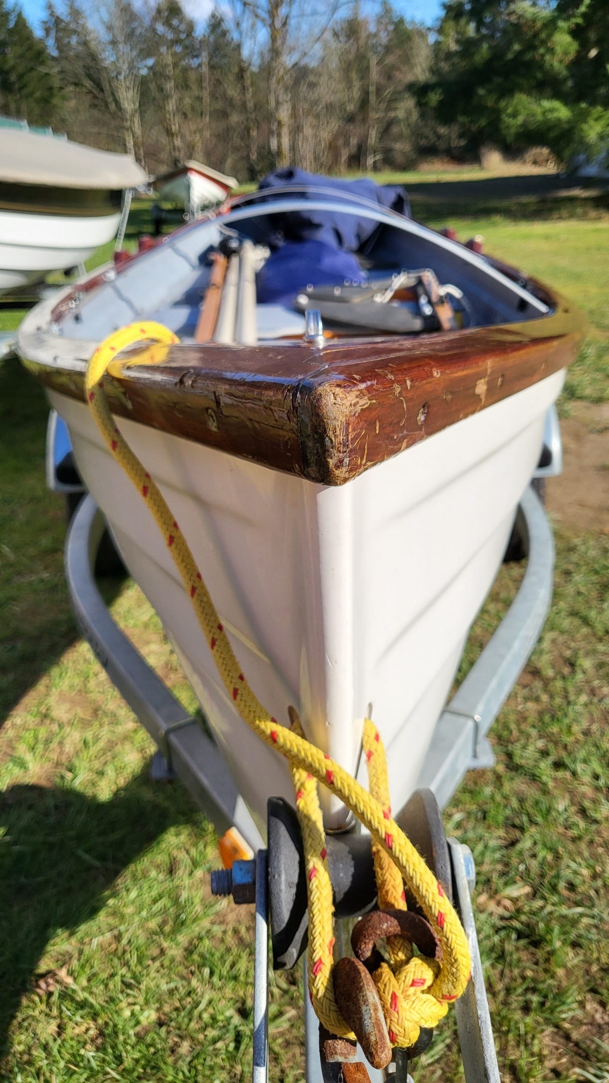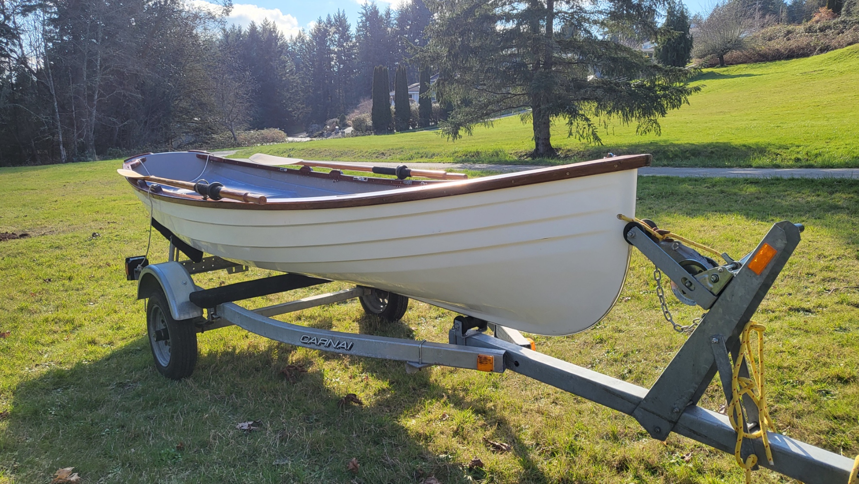 We are thrilled to have a lovely Whitehall Sailboat for sale that just arrived on consignment at our shop in Gig Harbor! Originally built in 2008, this sailboat in classic white is a beauty with wood trim, sliding rowing seat, stainless steel keel, kick-up rudder, tiller extension, and 2 pairs of 8′ wood spoon oars. A custom navy blue canvas cover and trailer are also included!