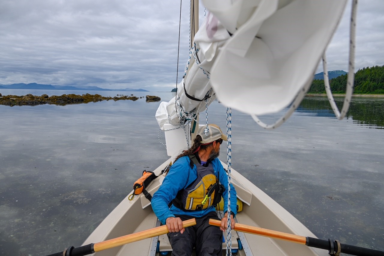 On our last day coming into Gustavus we were sweetly sailing upwind, making wide 90 degree turns, when progress in relation to the shore suddenly came to a halt. The opposing current had efficiently cancelled out a brisk 10+ knot wind. We pulled into a nook, dropped sail and rowed close to shore making use of the eddies. Once we were directly across the channel from Gustavus we hoisted sail once again and breezed into town.